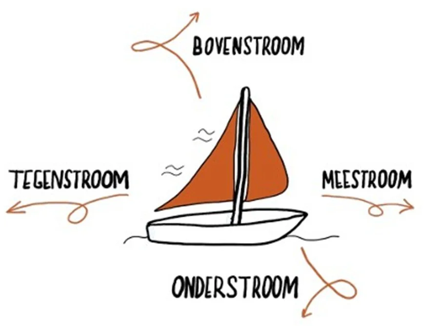 Als je naar een school kijkt als naar een boot, dan kun je er minstens van vier kanten naar kijken: van de voorkant, van de achterkant, van de bovenkant en van de onderkant. Vanuit de bootmetafoor zijn dat de meestroom, de tegenstroom, de bovenstroom en de onderstroom.