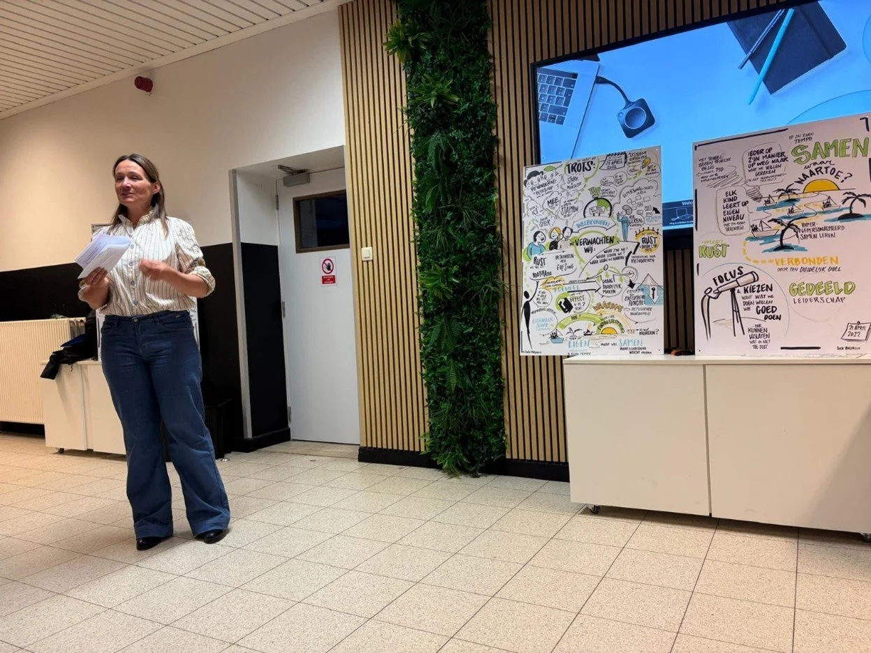 Daarna was het de beurt aan Esther De Caluwé, directeur van GO! Basisschool De Klimop Bonheiden om over het veranderingstraject in haar school te vertellen. De school heeft enkele jaren terug de schoolvisie vernieuwd en die mooi laten visualiseren door Axelle Vanquaillie. Ze gingen ook met een aantal leraren naar Sett en hoorden daar Peter Van de Moortel vertellen over Executieve Functies (toen daar in onderwijs nog weinig over werd gesproken). Begeleid door Peter gingen ze er als team mee aan de slag en startten ze ook met kindgesprekken. Dat liep niet van een leien dakje. In het begin was niet iedereen mee maar geleidelijk aan won de school aan draagkracht. Esther heeft heel goed op het tempo gelet: niet te snel, niet te traag. Toen de optie om met het EduNext transformatierad te werken, heeft ze dat even on hold gezet. Je kunt een team niet verder krijgen als ze nog niet instaat zijn om het te behappen. Esther spreekt dan ook over een traject zonder einde.