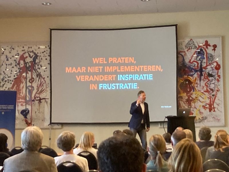Volgens Ben Tiggelaar, schrijver en gedragswetenschapper, draait veranderen om gedrag. Het gedrag van anderen dat je probeert te beïnvloeden én het eigen gedrag waarmee je dat doet. En dat is behoorlijk complex. Bij elke lezing vraagt hij aan de deelnemers meteen wat ze nadien gaan doen met zijn verhaal. Het gebeurt immers vaak dat mensen heel enthousiast zijn wanneer ze tijdens een keynote een nieuw inzicht opdoen. Als ze het een tijd nadien voor de tweede keer horen, zijn ze dat al wat minder. Als ze het voor de derde keer beluisteren en ze hebben er intussen nog niets mee gedaan, dan verandert het enthousiasme in frustratie. Over verandering praten en er niets mee doen, leidt tot verandermoeheid. Zo krijg je op een bepaald moment zelfs al buikpijn als iemand erover begint.