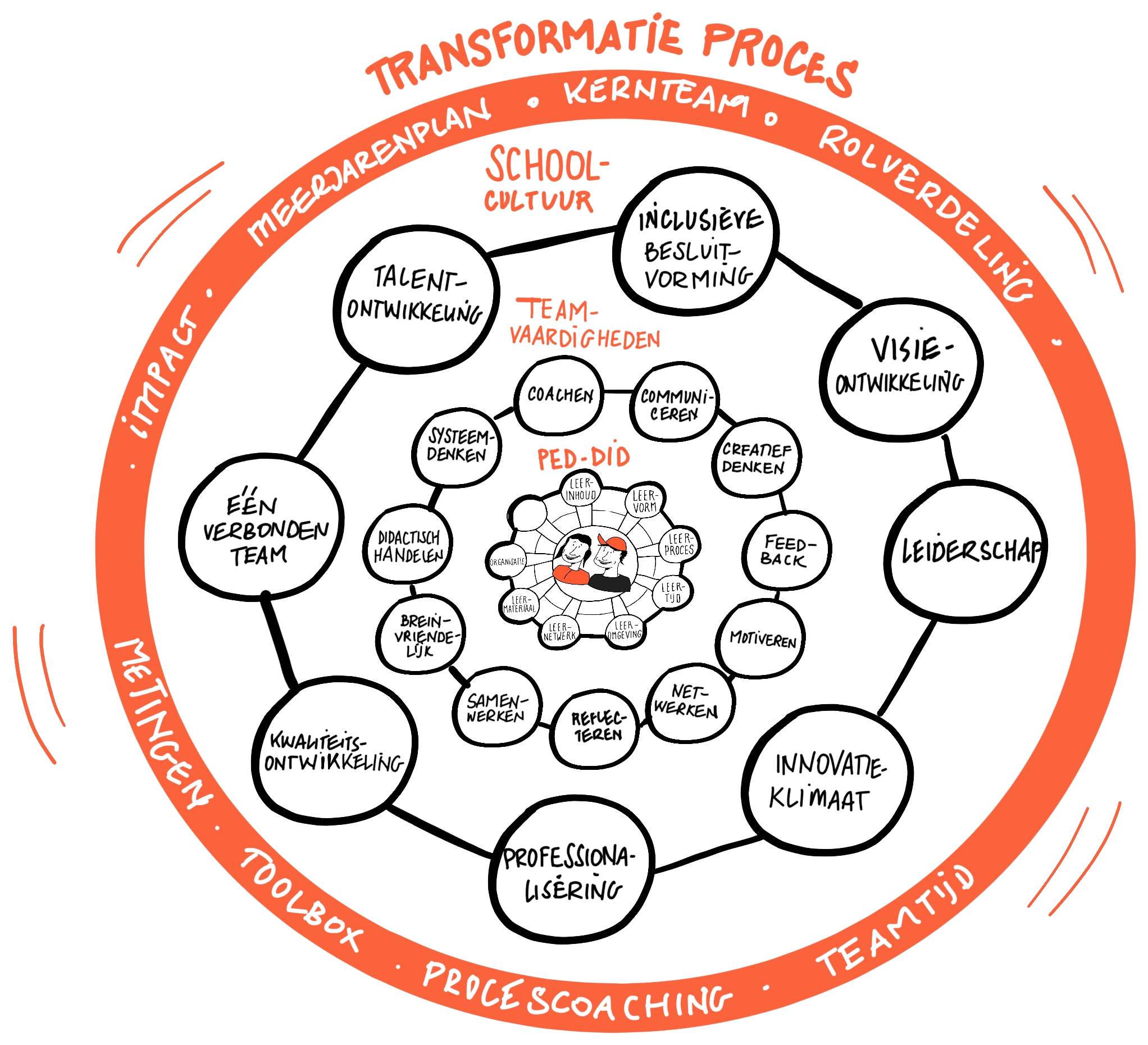 Schoolontwikkeling is een cyclische beweging die tijd en focus vraagt. Om deze beweging in gang te zetten en de samenhang te bewaken, gebruiken we het Transformatierad.